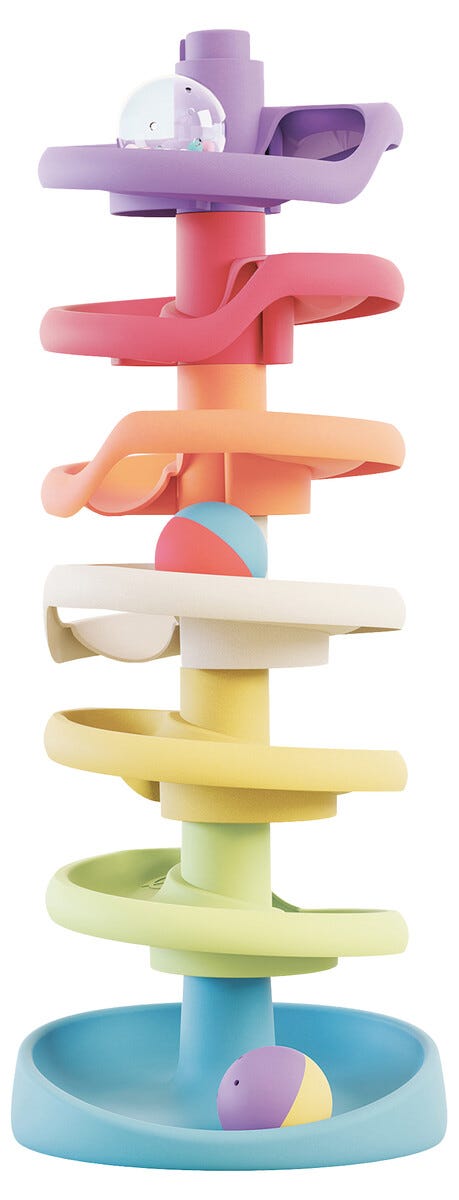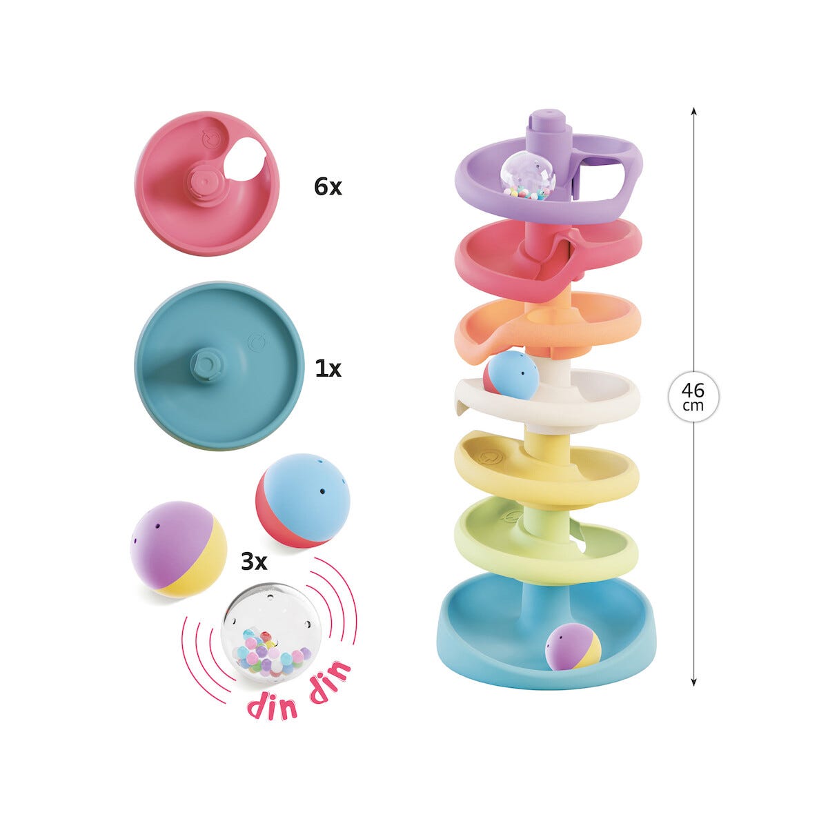 • Låt bollarna rullar nedför det färgglada tornet – engagerande lek för små barn.