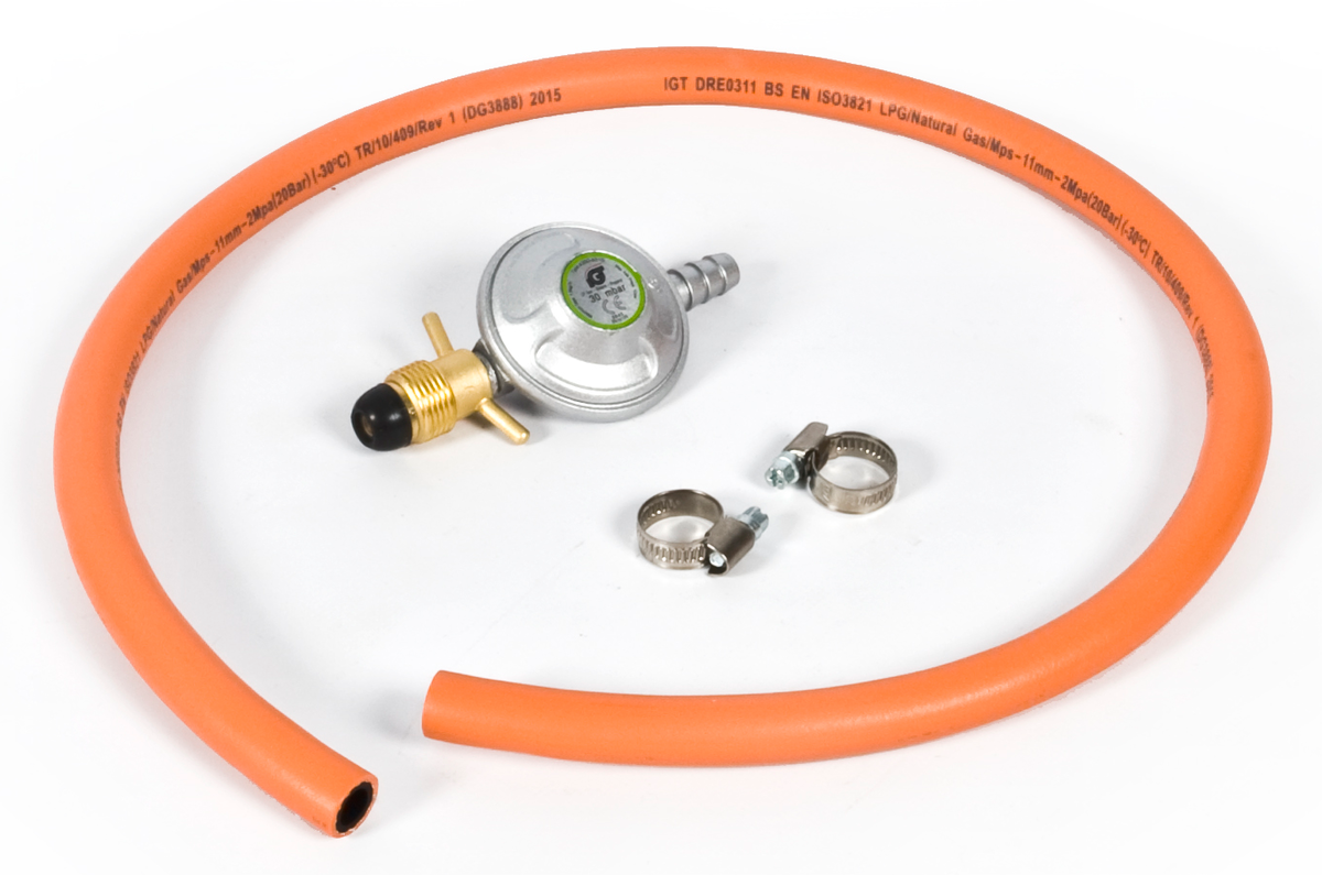 • Setet innehåller regulator, gasolslang och två kopplingar.