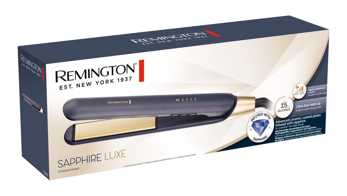 • Remington Sapphire Luxe plattång – justera temperaturen i 5 steg, 150-230 °C.
