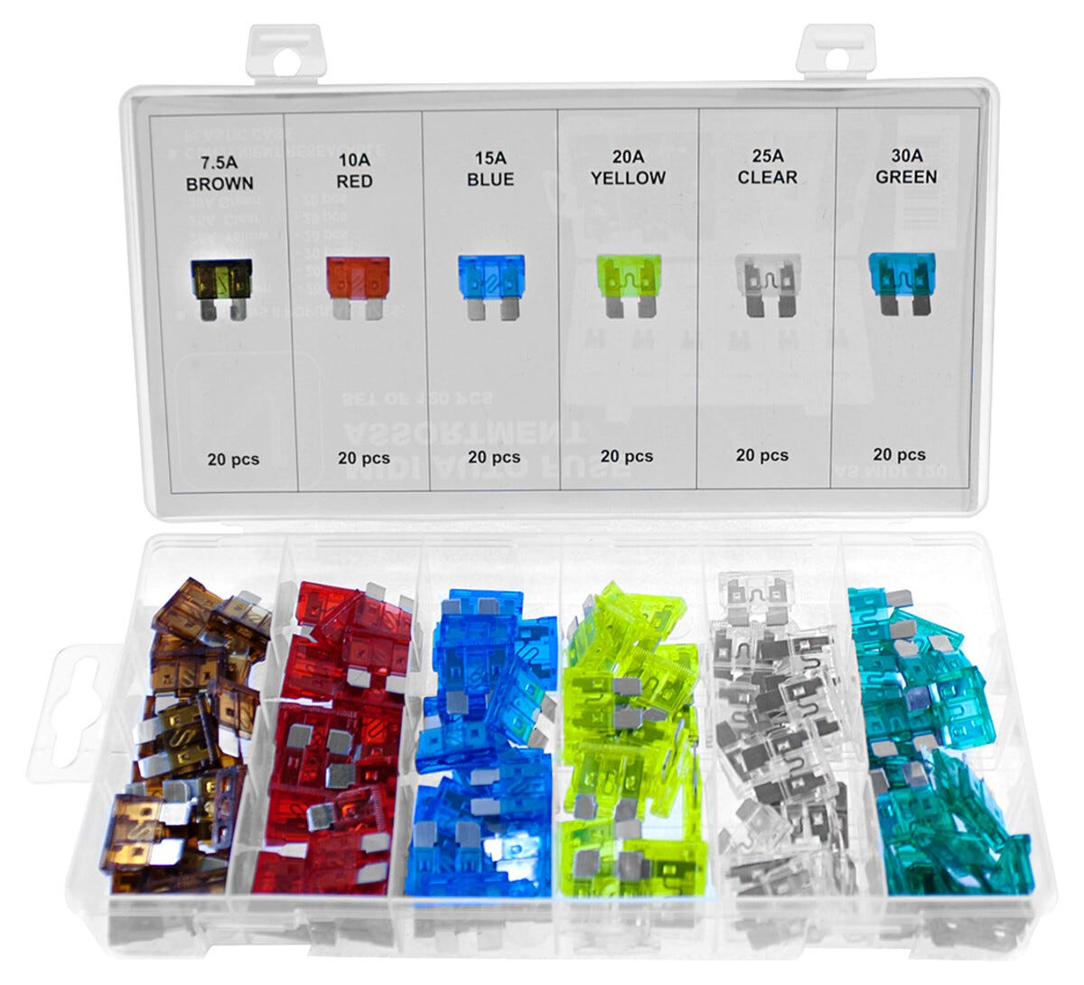• 20 säkringar av varje: 7,5 A, 10 A, 15 A, 20 A, 25 A och 30 A.