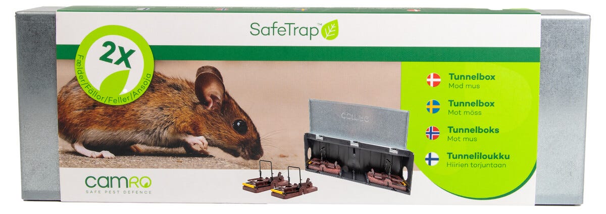 • SafeTrap tunnelbox med 2 fällor mot mus – återanvändbar.