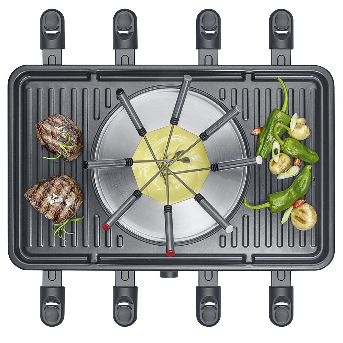 • Raclettegrill och fonduegryta med justerbar temperatur för optimal tillagning.