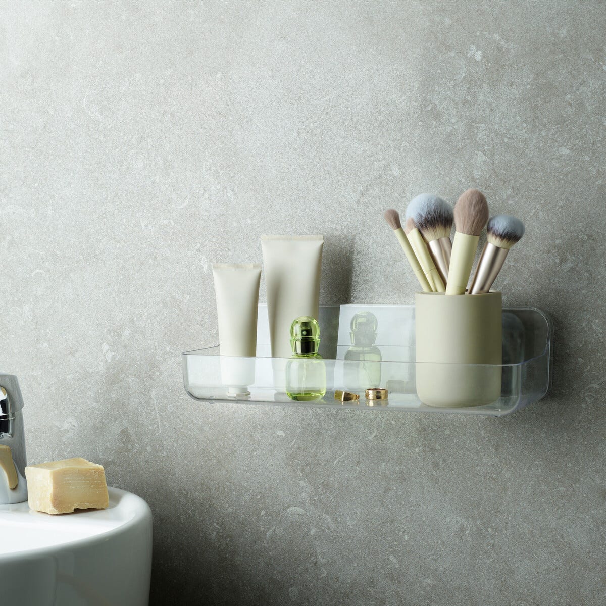 • Lättmonterad sminkhylla i klar plast – lätt att hålla ren.