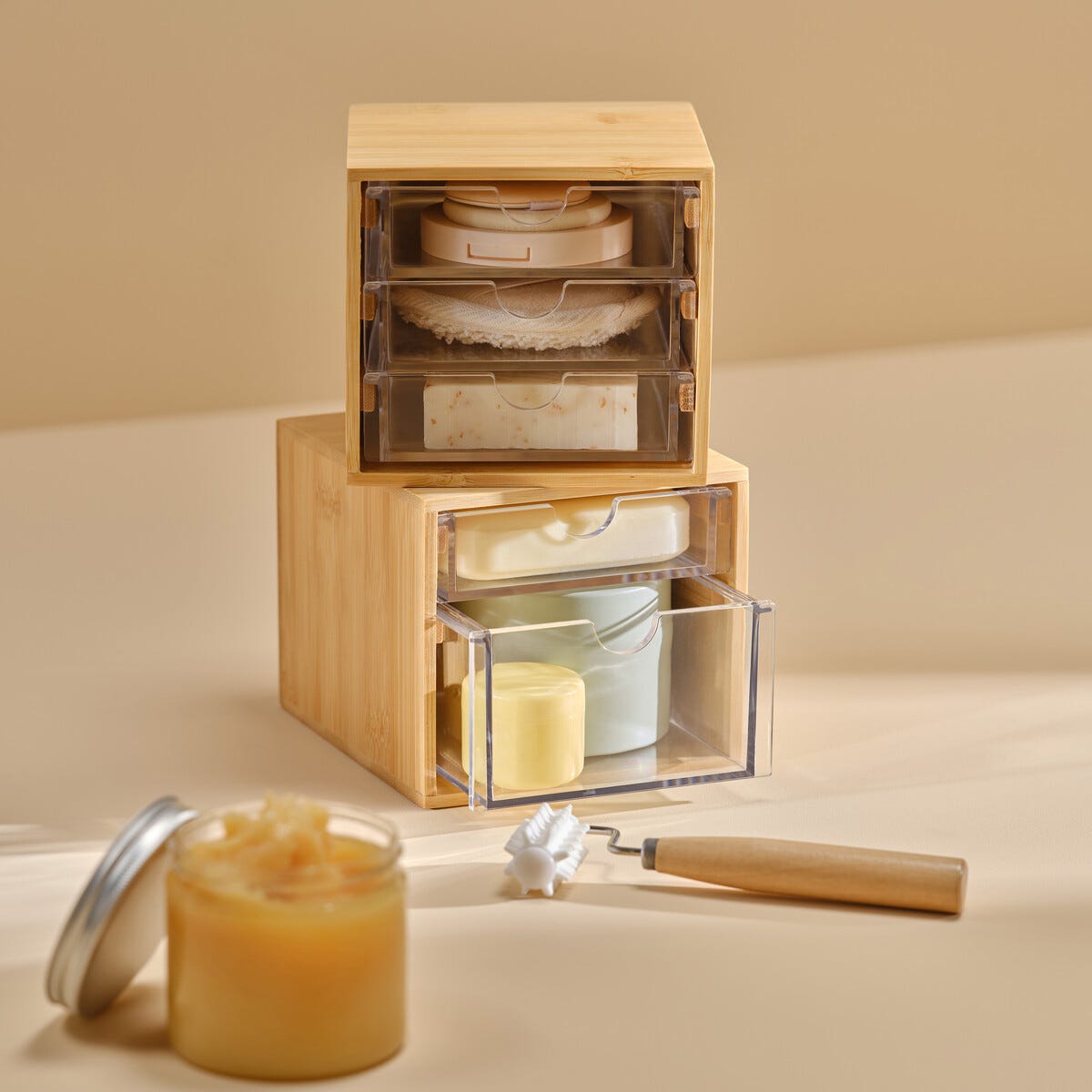 • Sminkförvaring i bambu – med stora och små utdragbara fack.