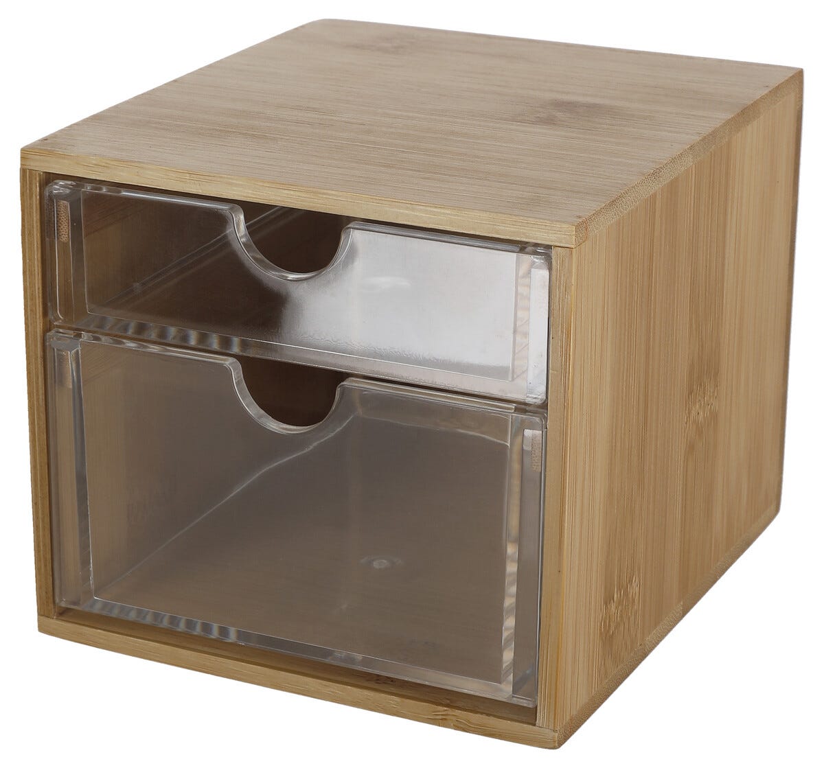 • Makeup- och smyckesförvaring i transparent plast och bambu.