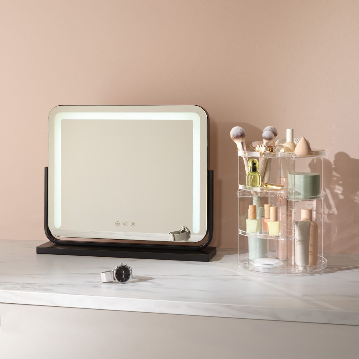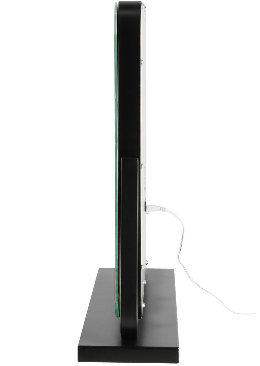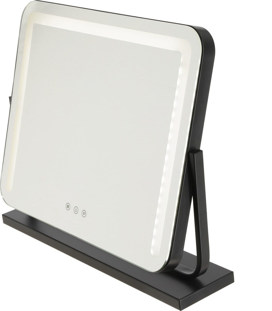 • Vinklingsbar bordsspegel med dimbar LED-belysning och touch-display.
