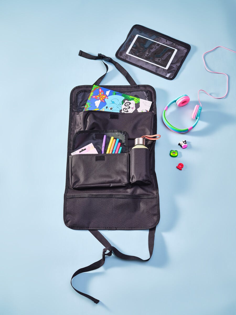 • Med fickor och hållare för surfplatta, vattenflaska, snacks, leksaker etc.