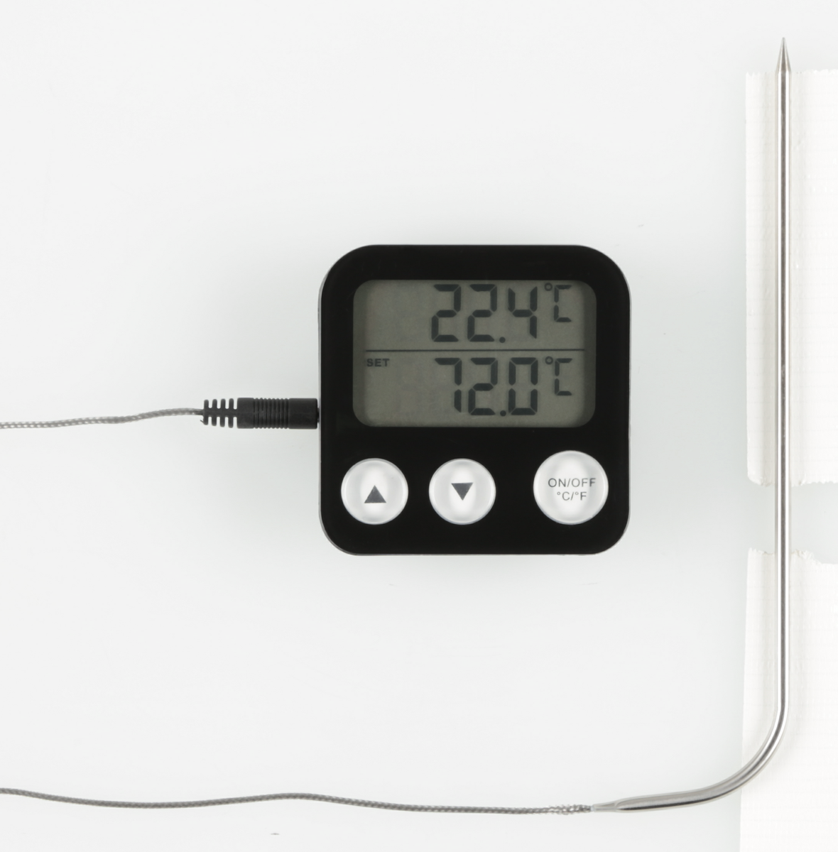 • Stektermometer med LCD-display som visar tydliga siffror.