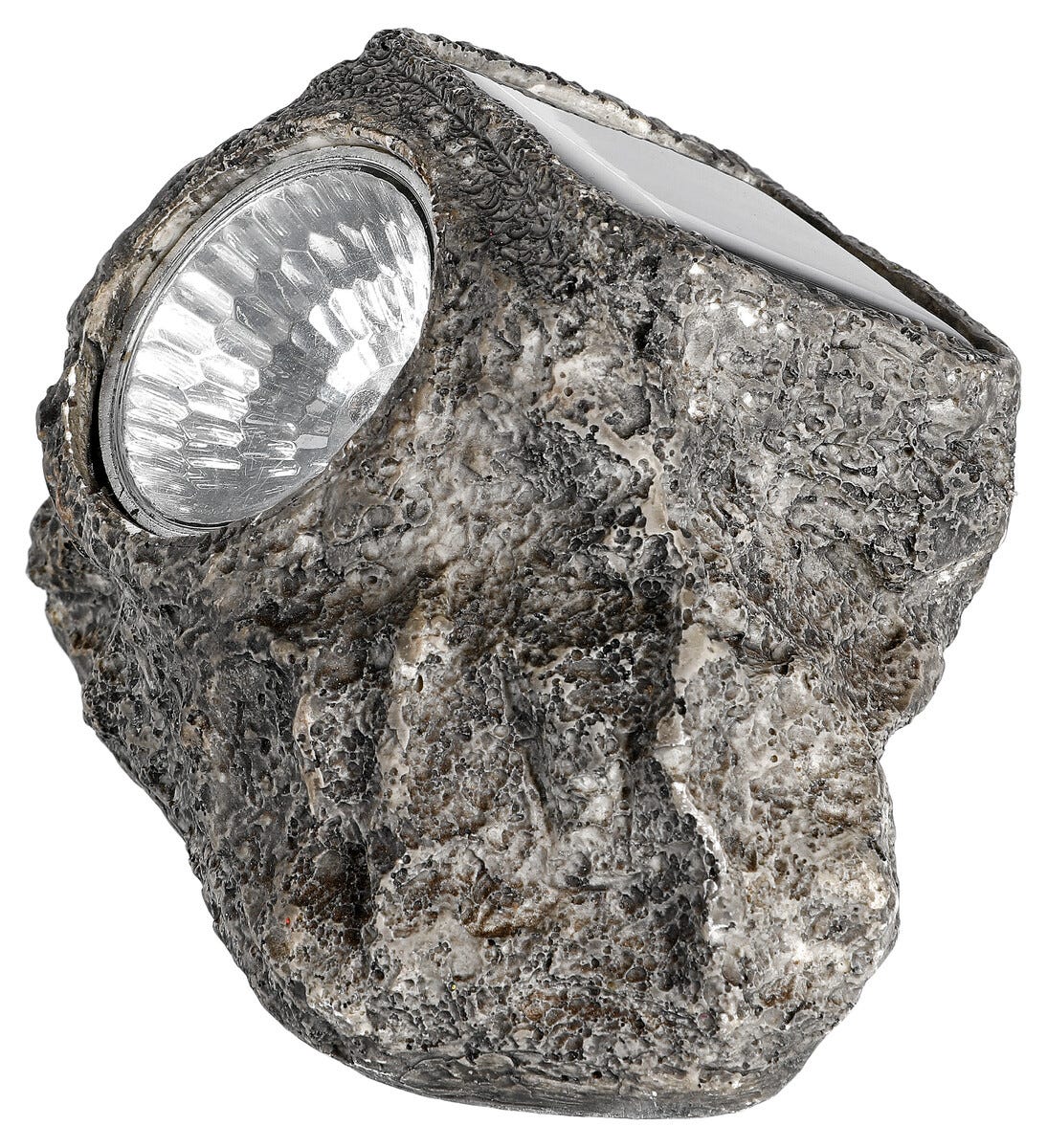• Solcellslampa med formen av en sten – sprider ett dekorativt sken i trädgården.