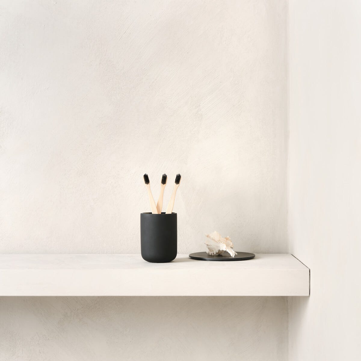 • Tandborstmugg i stengods med sammetslen, mattsvart finish.