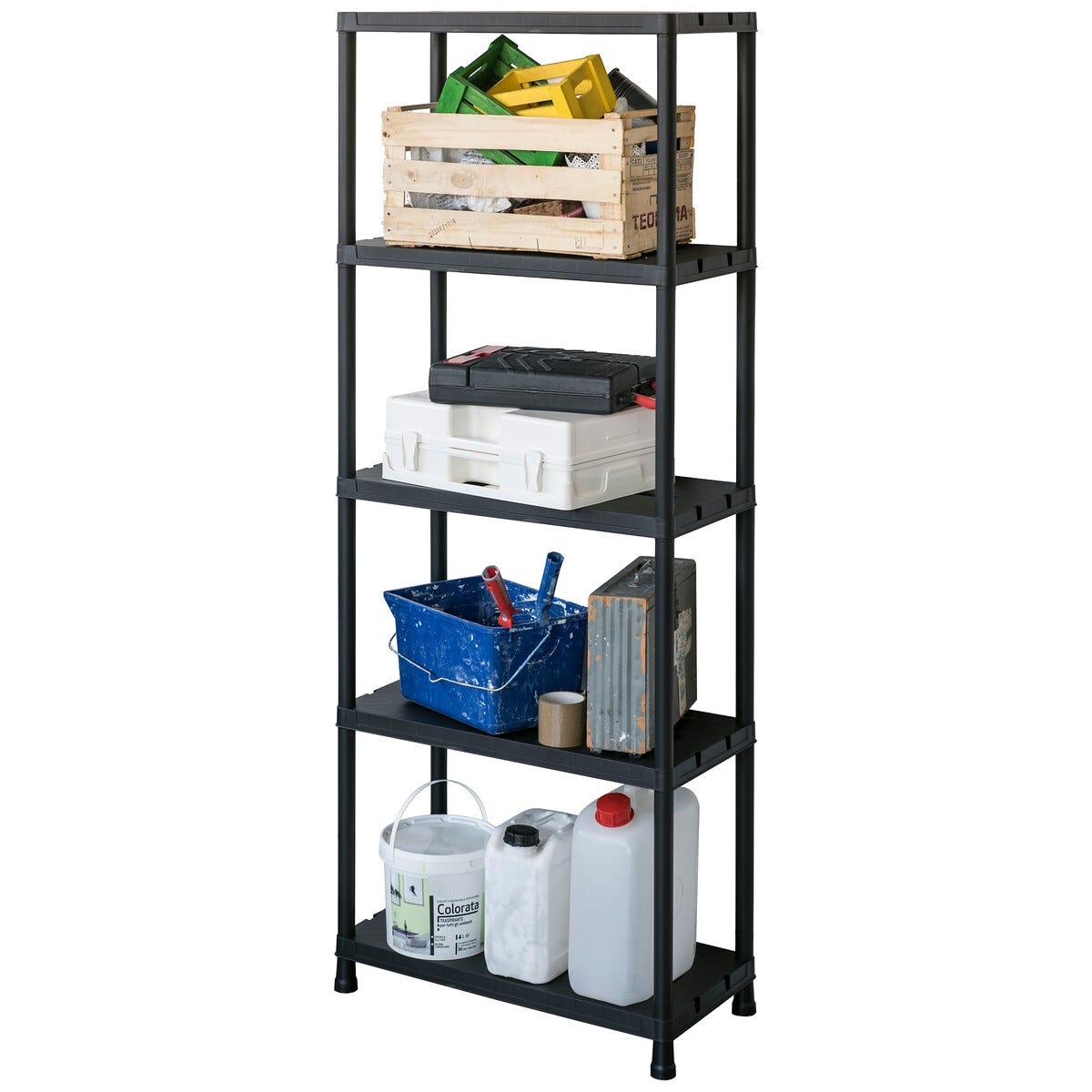 • Stabil förvaringshylla med 5 hyllplan – varje hyllplan klarar upp till 30 kg.