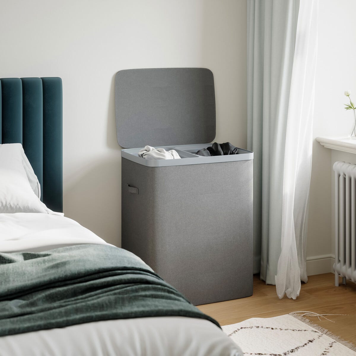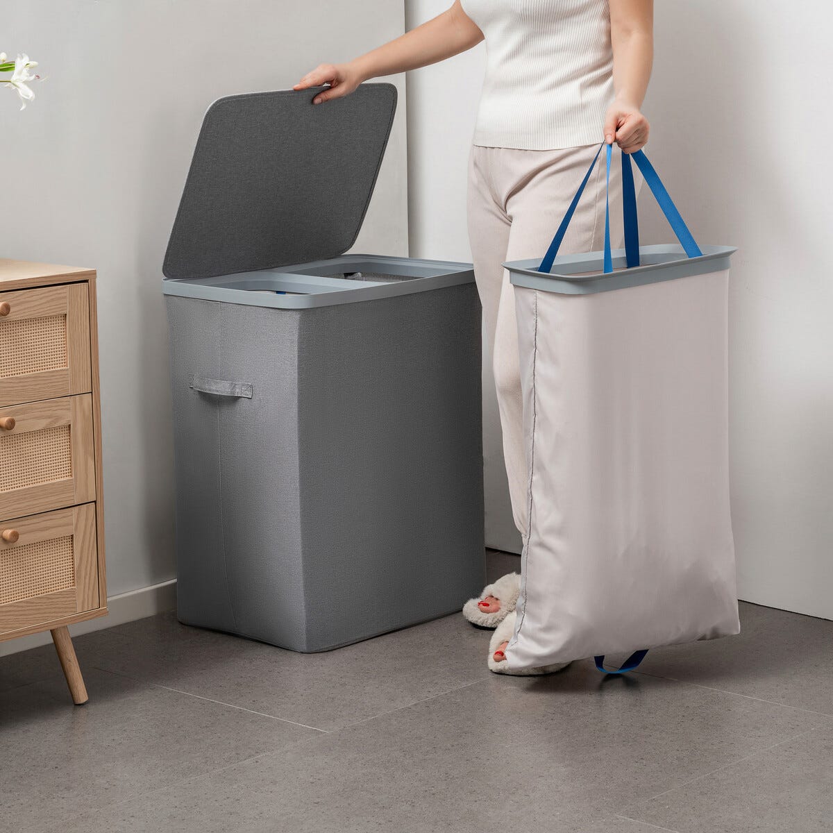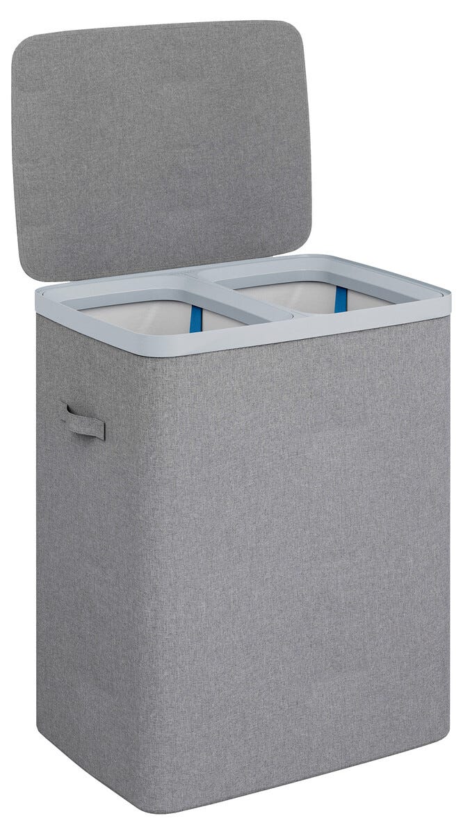 • Tvättkorg med lock och 2 fack för tvättpåsar (tvättpåsar ingår).