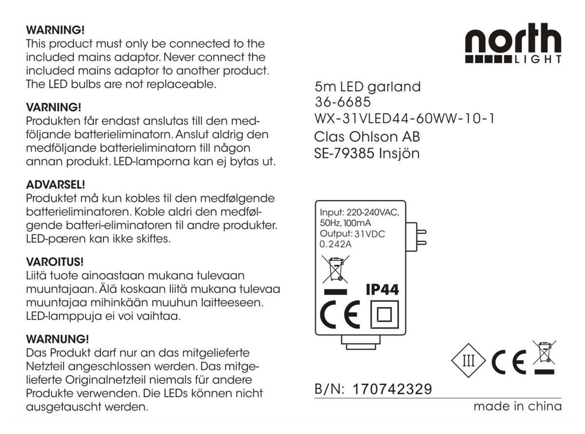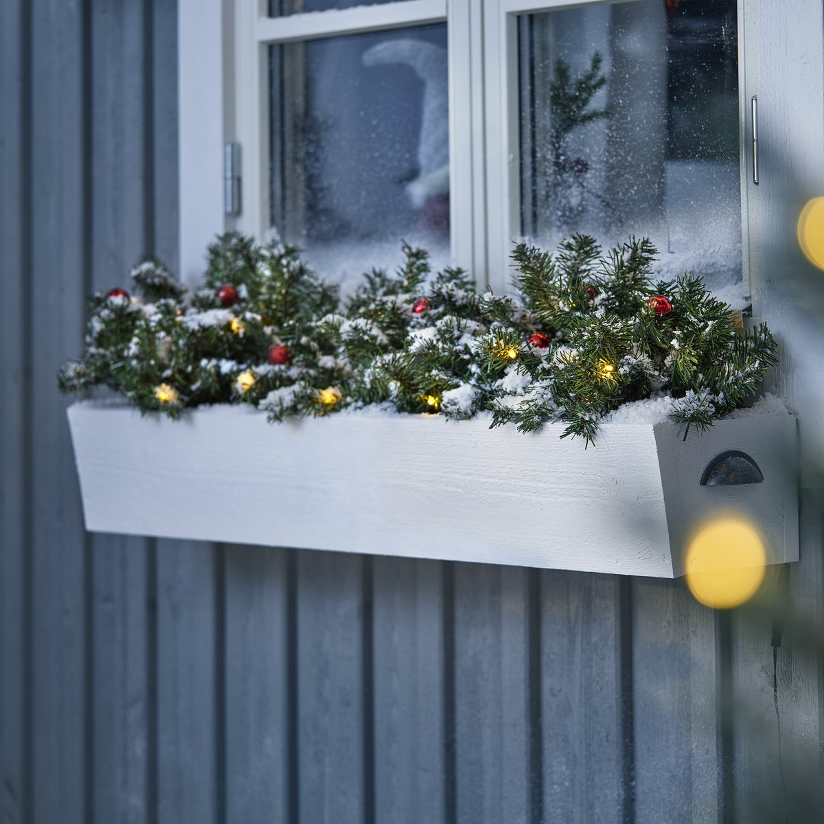 • Grangirlangen är 5 meter lång och har 60 varmvita LED-lampor. Anslutningskabel: 5 meter.