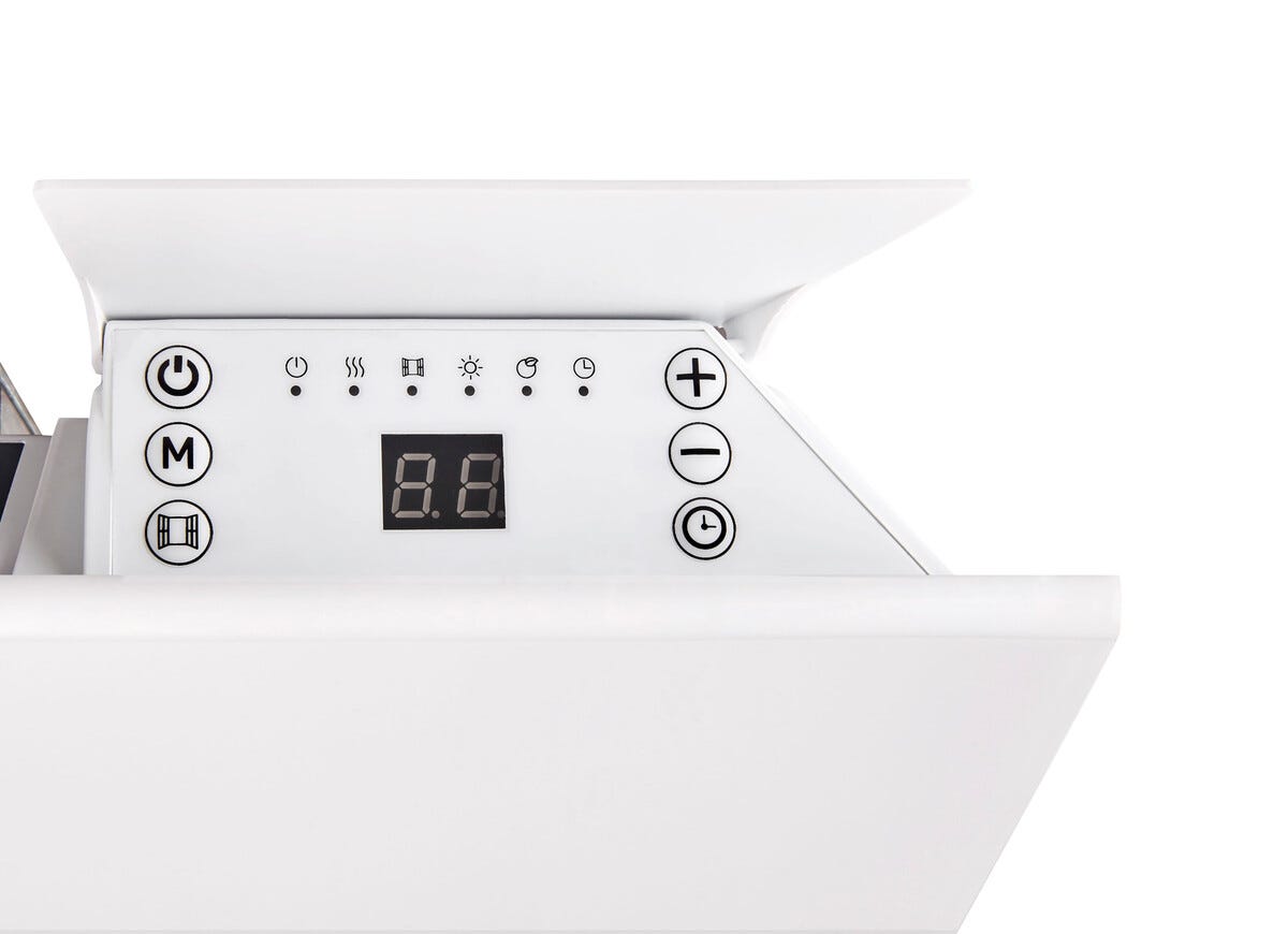 • Vitt, vägghängt elelement (600 W) med LED-display och automatisk avstängning.