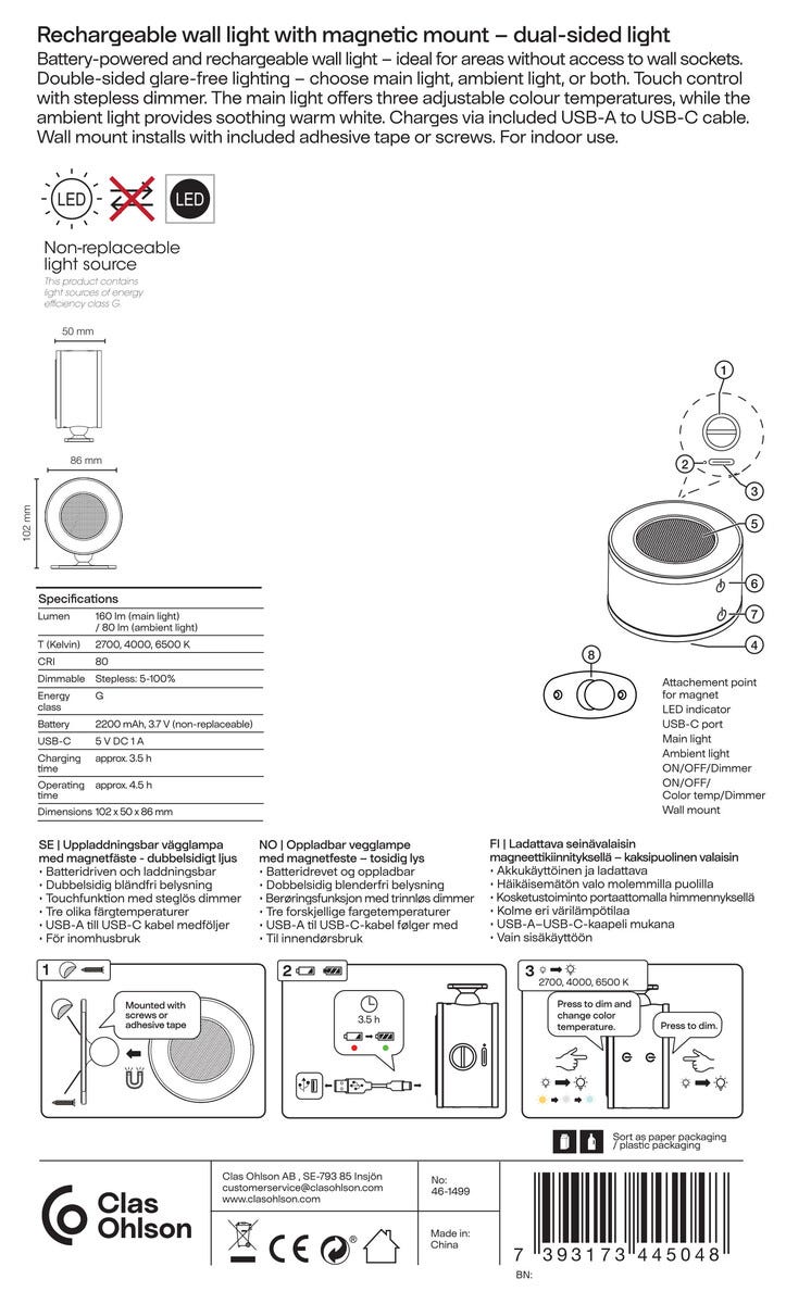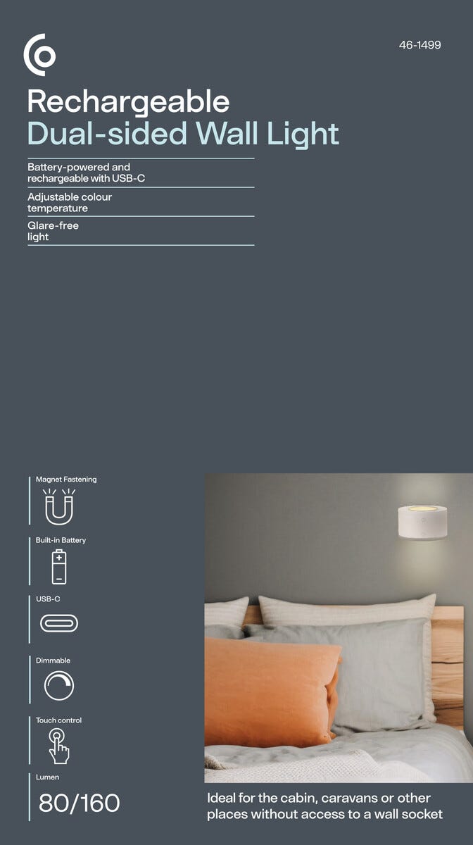 • Uppladdningsbar vägglampa LED – lyser med upp- och neråtriktat sken.