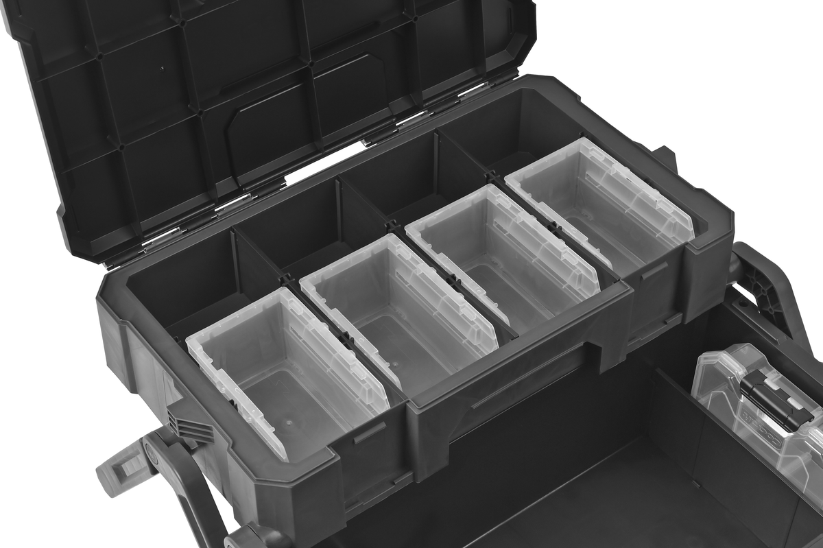 • Övre lådan - utfällbar, dubbla låsspännen i plast och 12 fack.