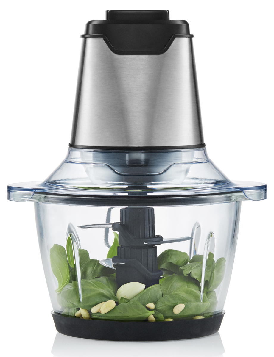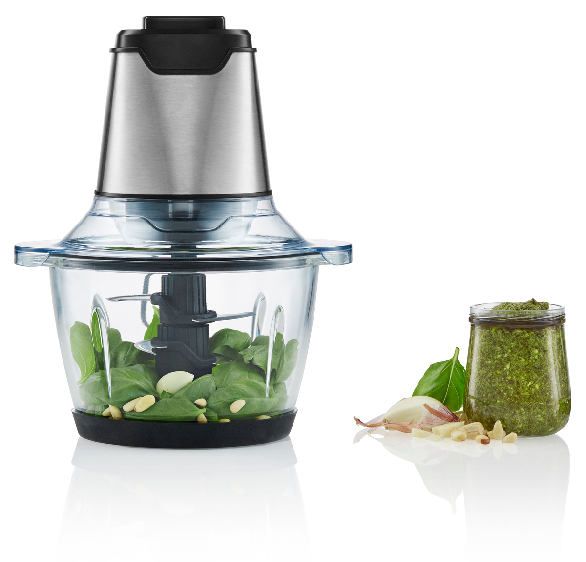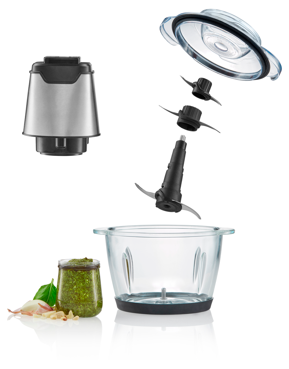 • Effekt 400 watt, stor glasbehållare på 1,2 liter och hackar upp till 500 ml åt gången.