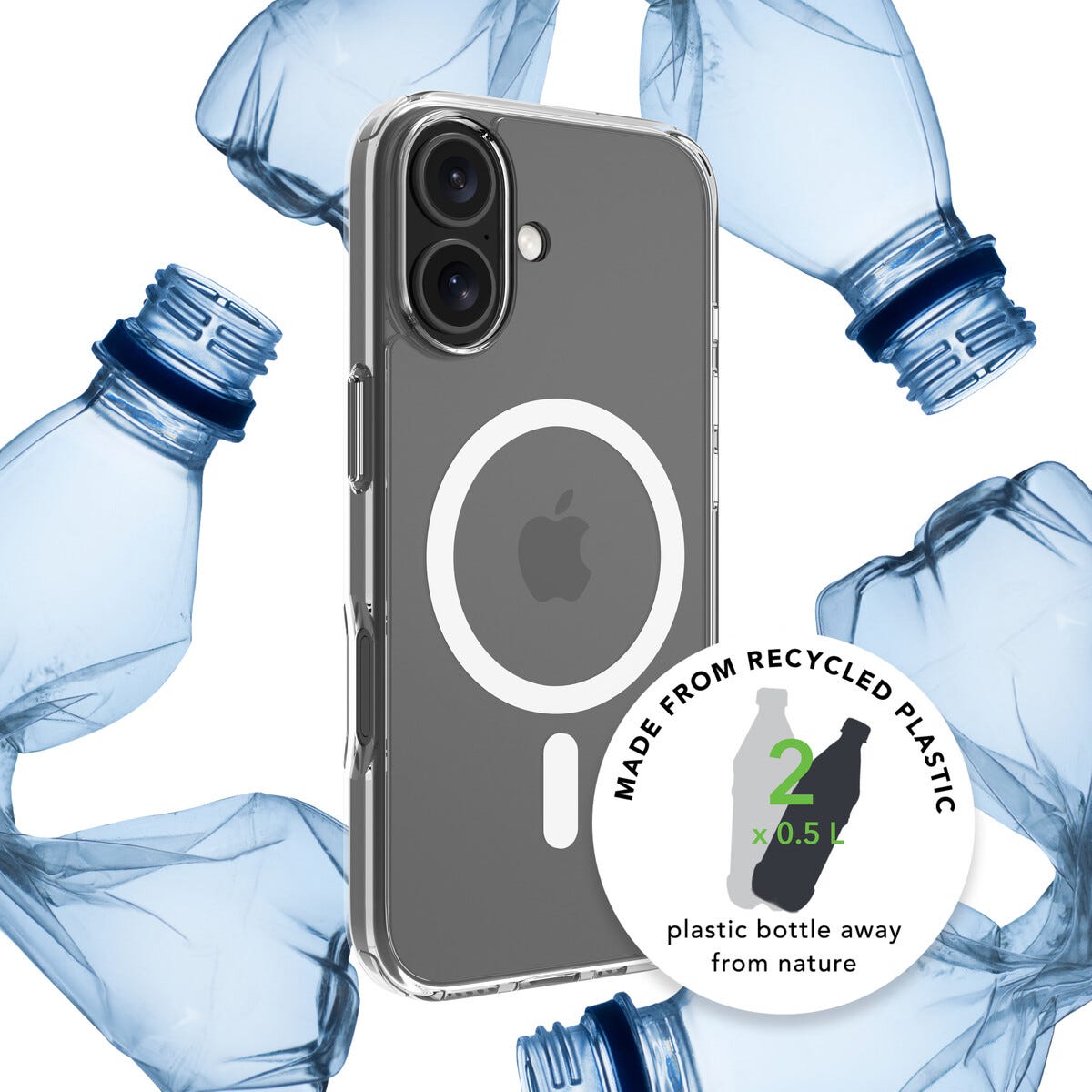 • Transparent, stötskyddande skal av återvunnen plast.